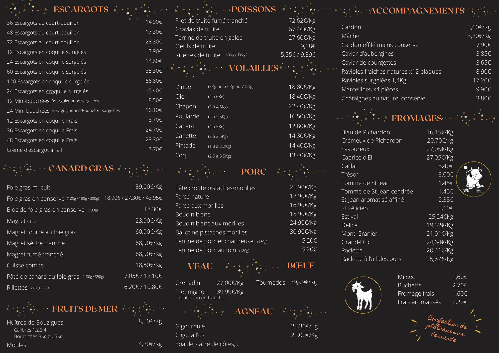 Nous vous avons sélectionné un large panel de nos produits pour élaborer vos repas de fêtes. Vous pouvez dors et déjà nous appeler ou passer en magasin pour réserver ce qui vous fait envie!
